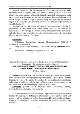 Одним из основных направлений государственной политики по защите прав ребенка согласно статье-43, Закона Республики Узбекистан «О гарантиях прав ребёнка», является содействие физическому, интеллектуальному, духовному и нравственному развитию детей. [ 1] В воспитании гармонично развитого ребёнка семья играет решающую роль. Это говорит о том, что в значительной степени именно от института семьи зависит и наше будущее, так как оно в руках подрастающего поколения.