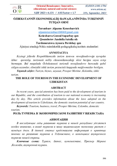 • В последующие годы развитию туризма в нашей республике уделяется особое внимание, и вклад туризма в нашу национальную экономику растет с каждым днем. В данной статье представлена информация о принятых законах по развитию туризма в Узбекистане, о потенциале внутреннего туризма нашей страны.