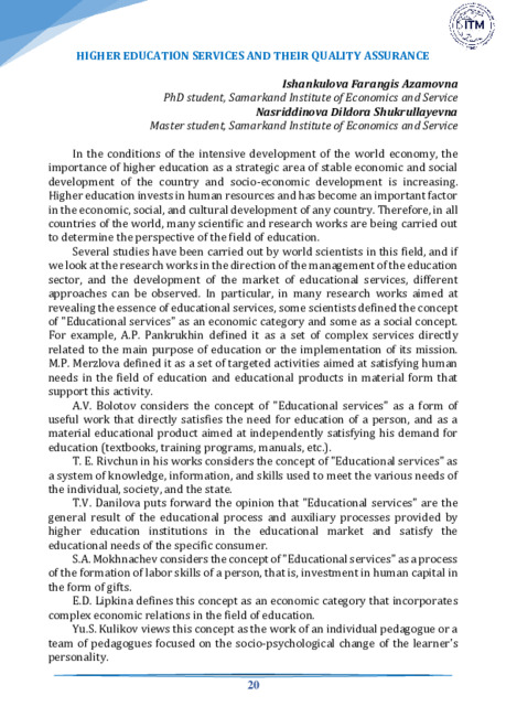 Ishankulova, F., & Nasriddinova, D. (2023). HIGHER EDUCATION SERVICES AND THEIR QUALITY ASSURANCE. Издания, 20–25. извлечено от https://www.inlibrary.uz/index.php/editions/article/view/92119