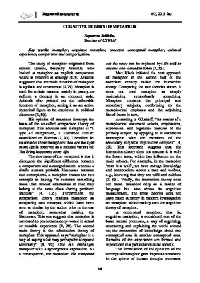 Данная статья демонстрирует когнитивный подход к исследованию метафор. Автор изучает теории нескольких учёных о когнитивных метафорах и представляет собственную точку зрения по теме исследования