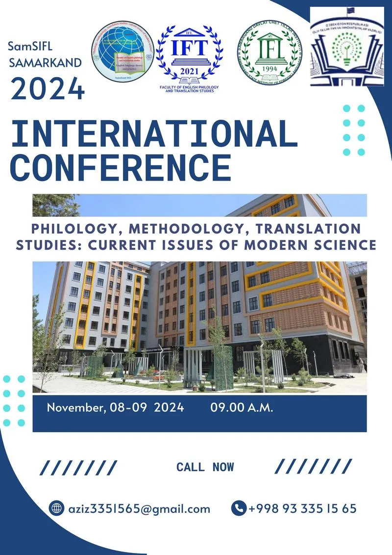 0‘zbekiston Respublikasi Oliy ta’lim, fan va innovatsiyalar vazirligining 2024-yil 18-yanvardagi “O'zbekiston Respublikasi Prezidentining 2023-yil 4-iyuldagi PQ-200 qarori ijrosini ta’minlash to‘g‘rsida”gi №16-sonli buyrug‘i ijrosini ta’minlash maqsadida Samarqand davlat chet tillar instituti “Ingliz tili nazariyasi va amaliyoti” kafedrasi tomonidan 2024-yil 08-09-noyabr kunlari xalqaro ilmiy-amaliy anjuman o'tkaziladi.