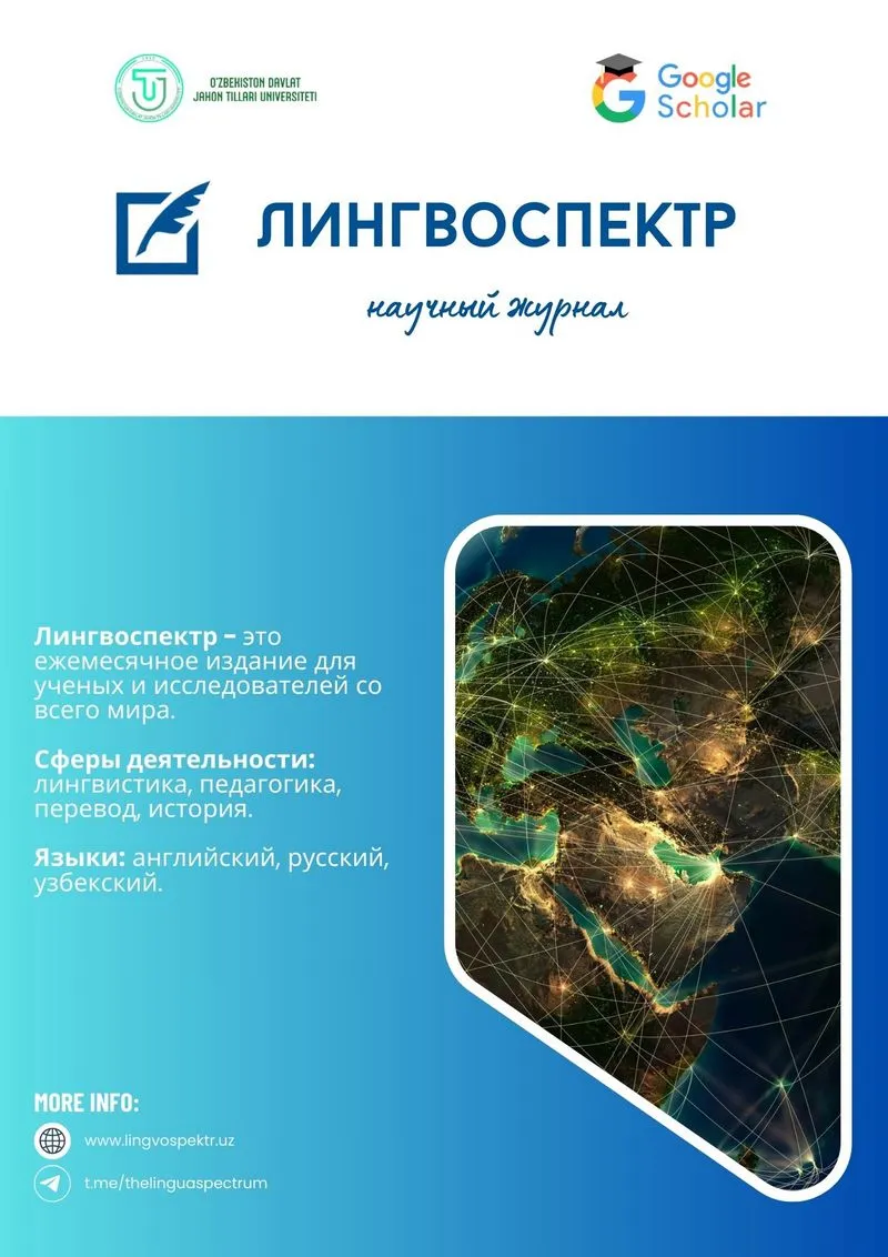 Lingvospektr jurnali o'zbek, rus va ingliz tillarida chop etiladigan onlayn ilmiy nashrdir. Uning maqsadi tilshunoslik, filologiya va pedagogika sohasidagi zamonaviy tadqiqotlarni yoritib berish, olimlar va tadqiqotchilarga bilim va g'oyalarni almashish uchun platforma yaratishdir. Jurnal xalqaro nashr standartlarini qo'llab-quvvatlaydi, fanlararo tadqiqotlarni rivojlantirishga va ilmiy yutuqlarni tezkor tarqatishga yordam beradi.