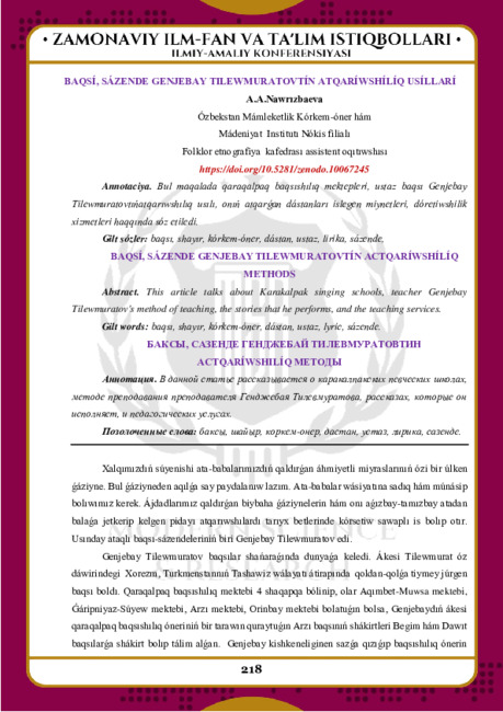 This article talks about Karakalpak singing schools, teacher Genjebay