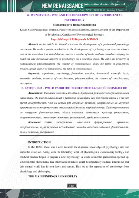 Аннотация. В статье показаны взгляды В. Вундта на развитие экспериментальной