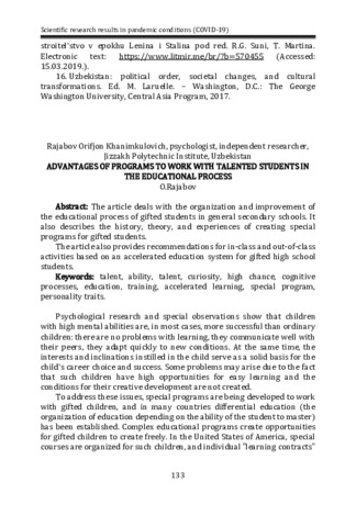 The article deals with the organization and improvement of the educational process of gifted students in general secondary schools. It also describes the history, theory, and experiences of creating special programs for gifted students. The article also provides recommendations for in-class and out-of-class activities based on an accelerated education system for gifted high school students
