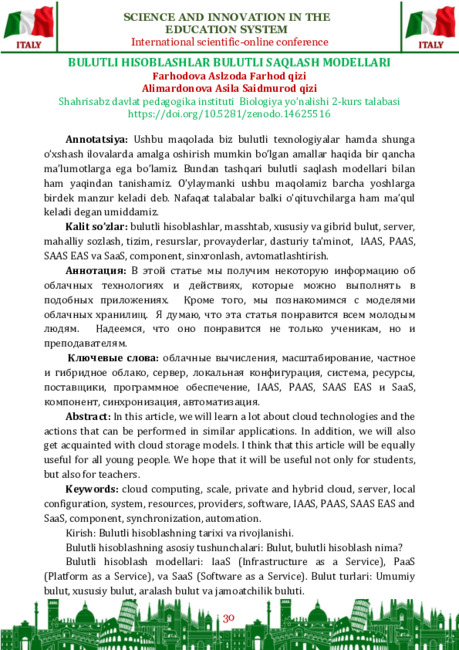 Ushbu maqolada biz bulutli texnologiyalar hamda shunga o’xshash ilovalarda amalga oshirish mumkin bo’lgan amallar haqida bir qancha ma’lumotlarga ega bo’lamiz. Bundan tashqari bulutli saqlash modellari bilan ham yaqindan tanishamiz. O’ylaymanki ushbu maqolamiz barcha yoshlarga birdek manzur keladi deb. Nafaqat talabalar balki o’qituvchilarga ham ma’qul keladi degan umiddamiz.