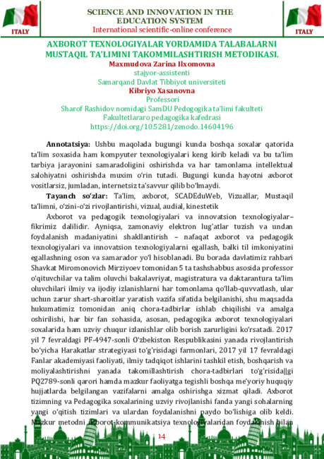 texnologiyalarni, “SCADEduWeb” mualliflik metodikasini qo‘llash kabilar shular