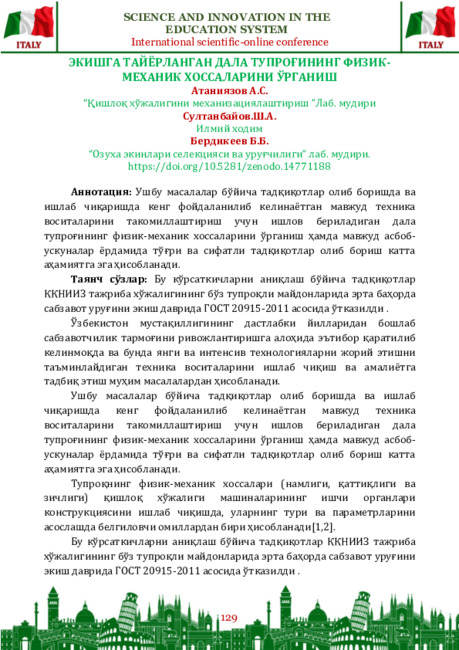 ЭКИШГА ТАЙЁРЛАНГАН ДАЛА ТУПРОҒИНИНГ ФИЗИК-МЕХАНИК ХОССАЛАРИНИ ЎРГАНИШ
