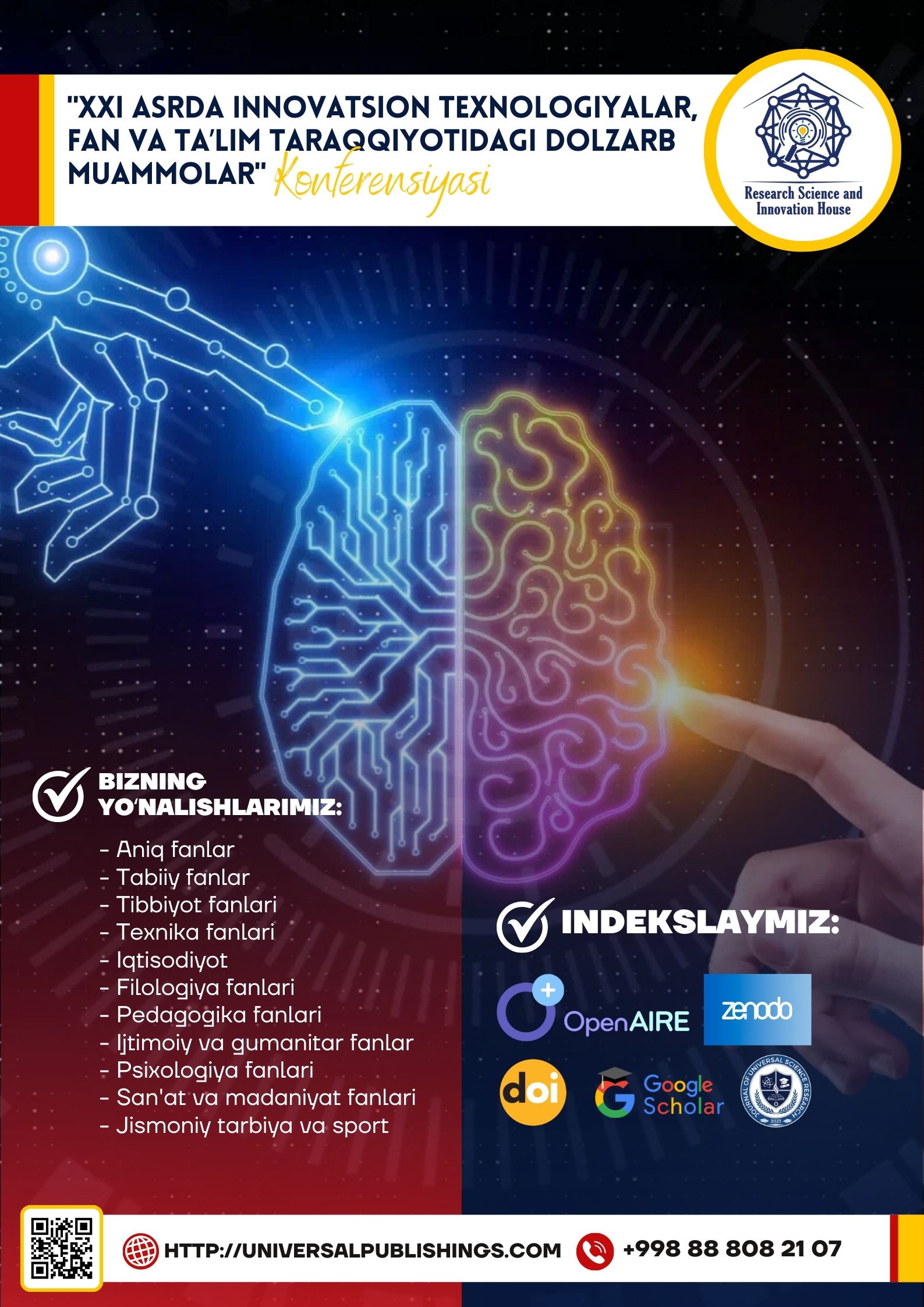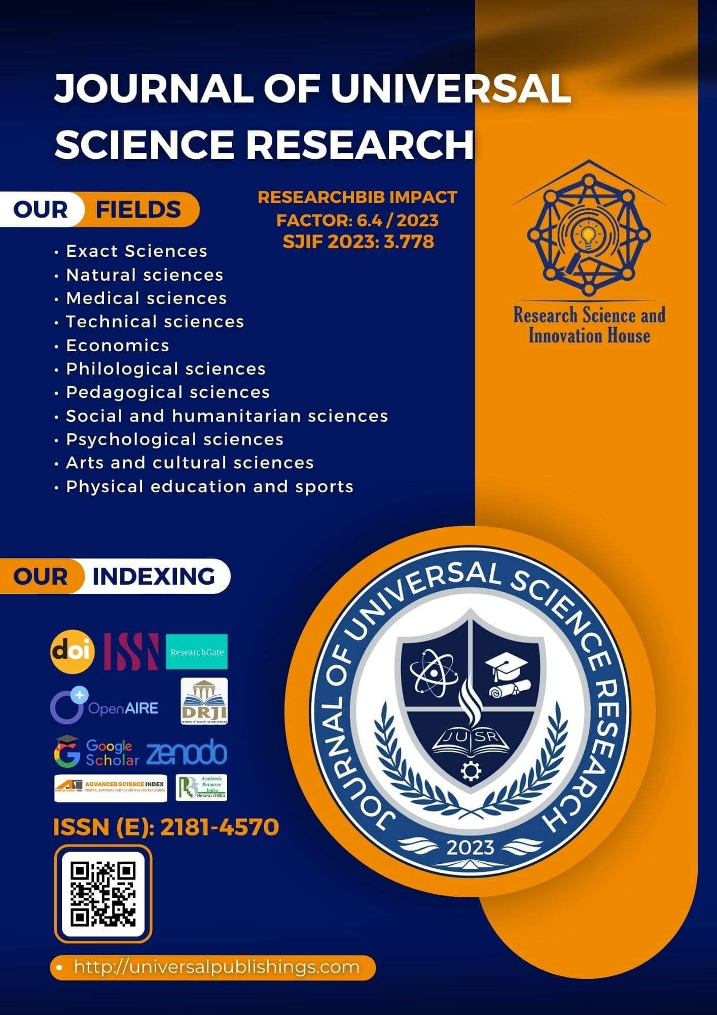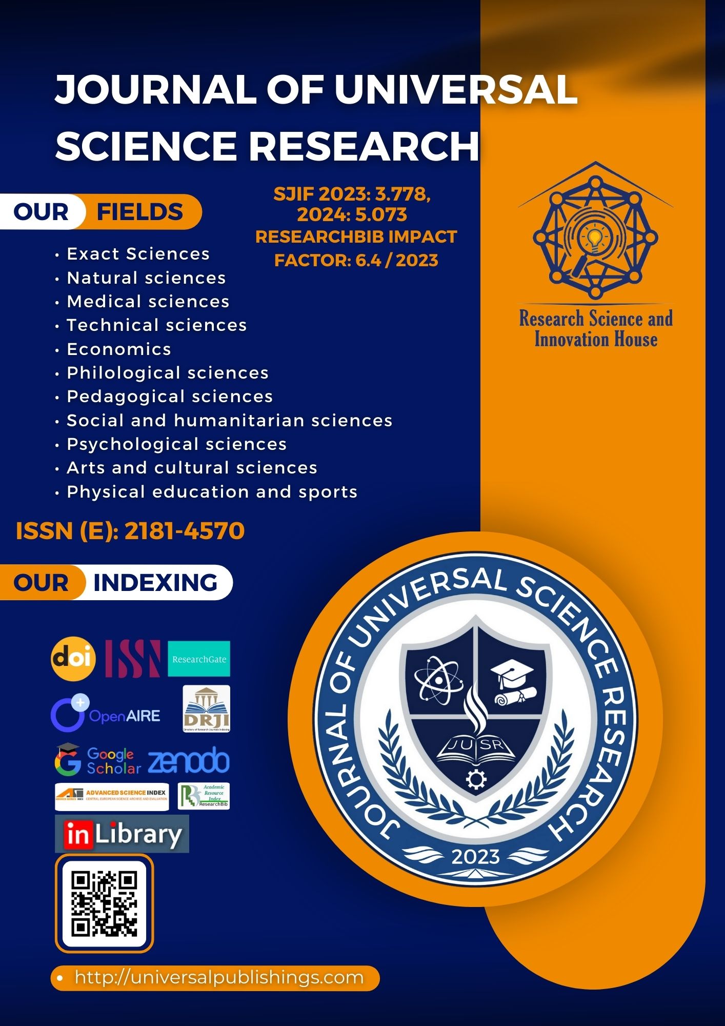Журнал универсальных научных исследований (JUSR) (ISSN: 2181-4570) — этот международный журнал с открытым доступом публикует оригинальные исследования и статьи в различных областях. Основная цель — предложить интеллектуальную платформу для ученых со всего мира и способствовать междисциплинарным исследованиям в области прикладных наук. Этот журнал всеобъемлющий во всех областях. Все рукописи должны быть подготовлены на узбекском, английском, русском, каракалпакском, таджикском и немецком языках и подлежат тщательному рецензированию. Научный журнал «Журнал универсальных научных исследований (ЮСР)» зарегистрирован как общество с ограниченной ответственностью для издания периодических изданий 16.01.2023 под номером №2060968. Зарегистрировано как средство массовой информации Агентством информации и массовых коммуникаций при Администрации Президента Республики Узбекистан 13.02.2023 под номером №063228.